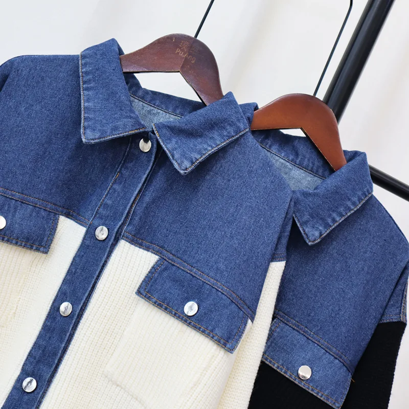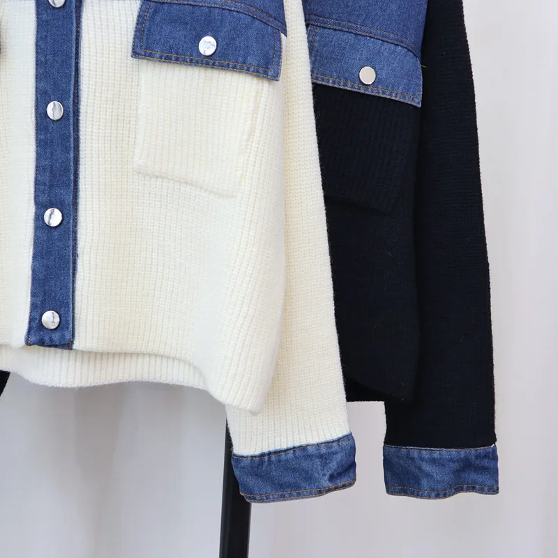 2025 Autumn Winter New Spliced Denim Knitted Cardigan Short Korean Version Loose and Versatile Design Sweater Jacket
