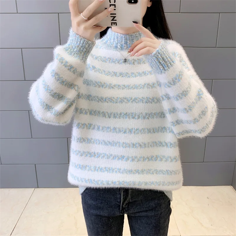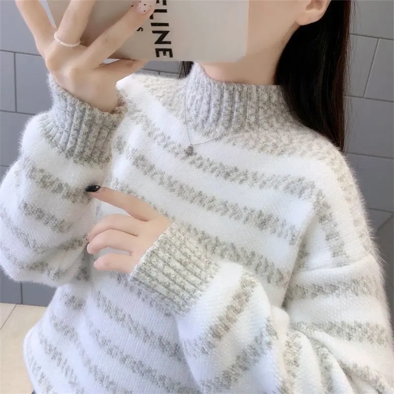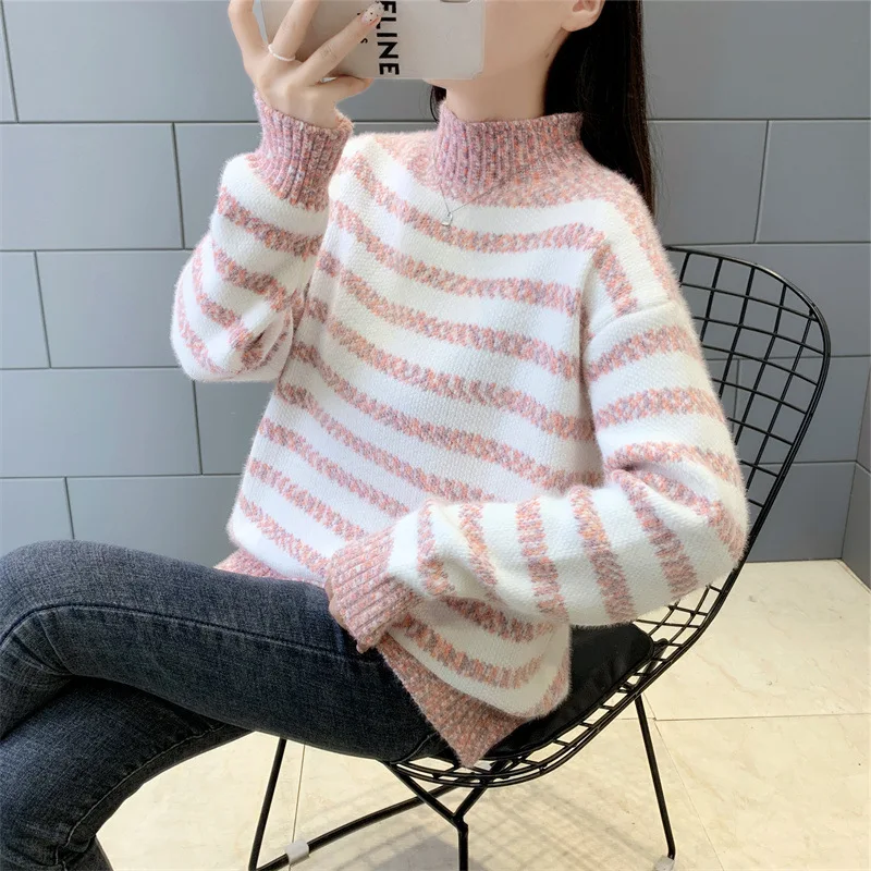 2025 Autumn Winter Women Sweet Sweater Fur Striped Stand Collar Warm Knitwear Loose Long Sleeve Pullover Tops Thick Knit Sweater