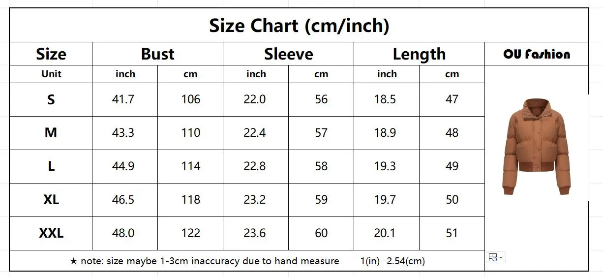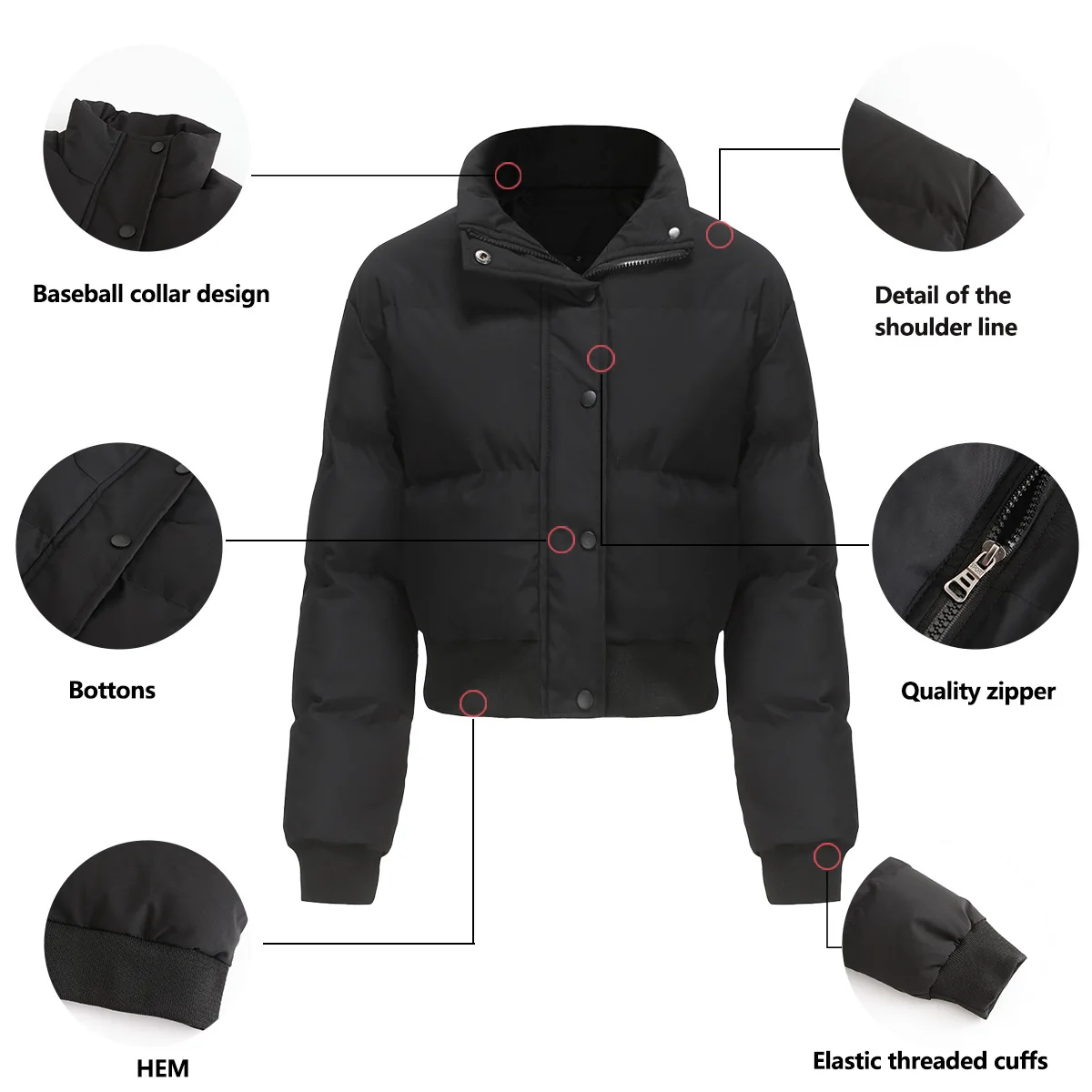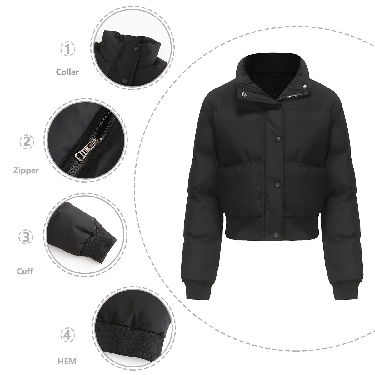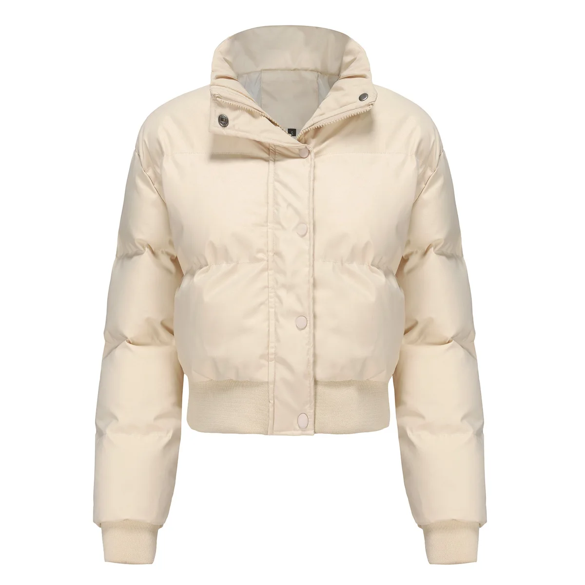 2025 Winter Women Padded Short Coat Solid Color Quilted Jacket Long Sleeve Stand Collar Zipper Button Warm Casual Bread Coat