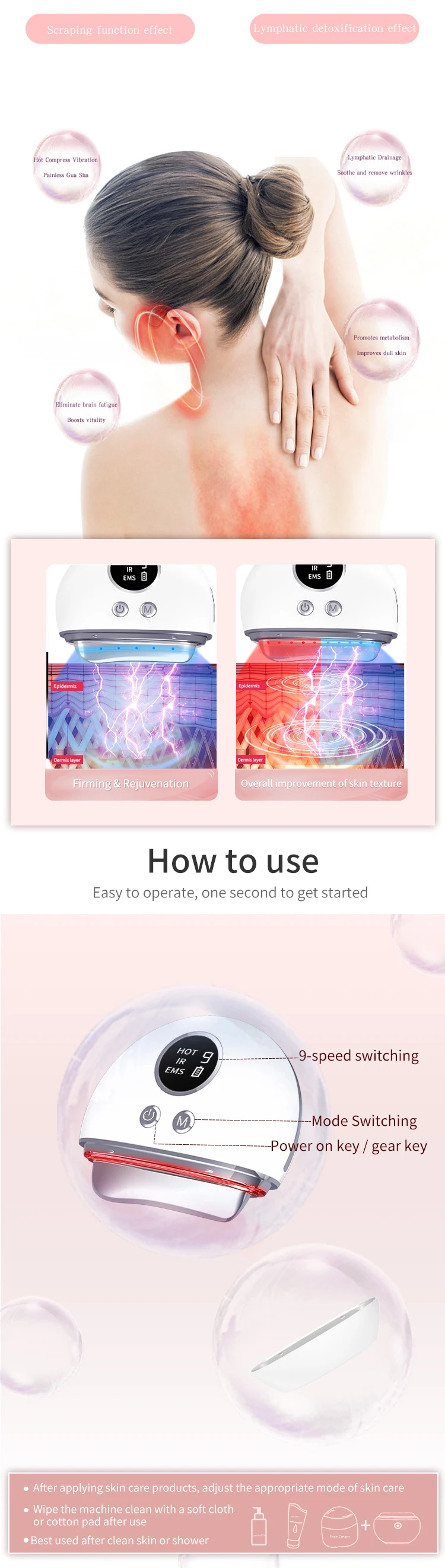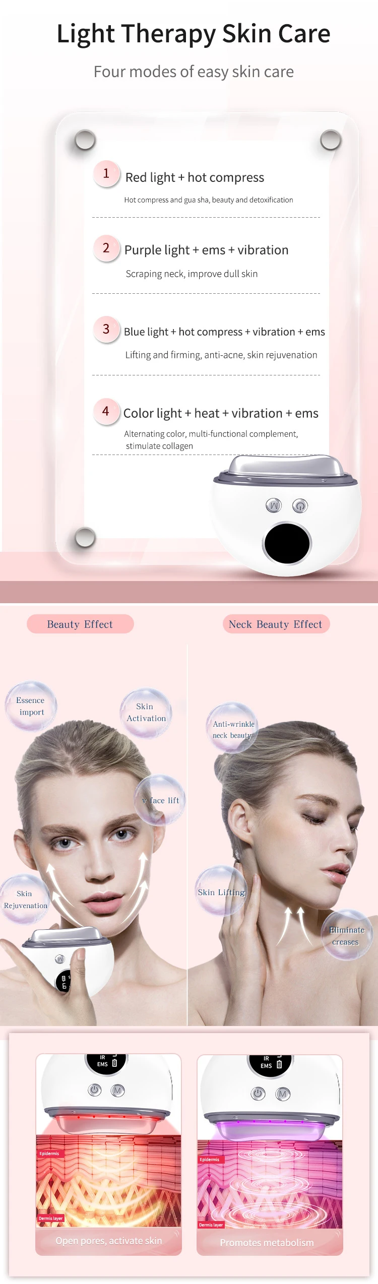Is a combination of warmth, vibration, color light, microcurrent in one skin massage care products. |