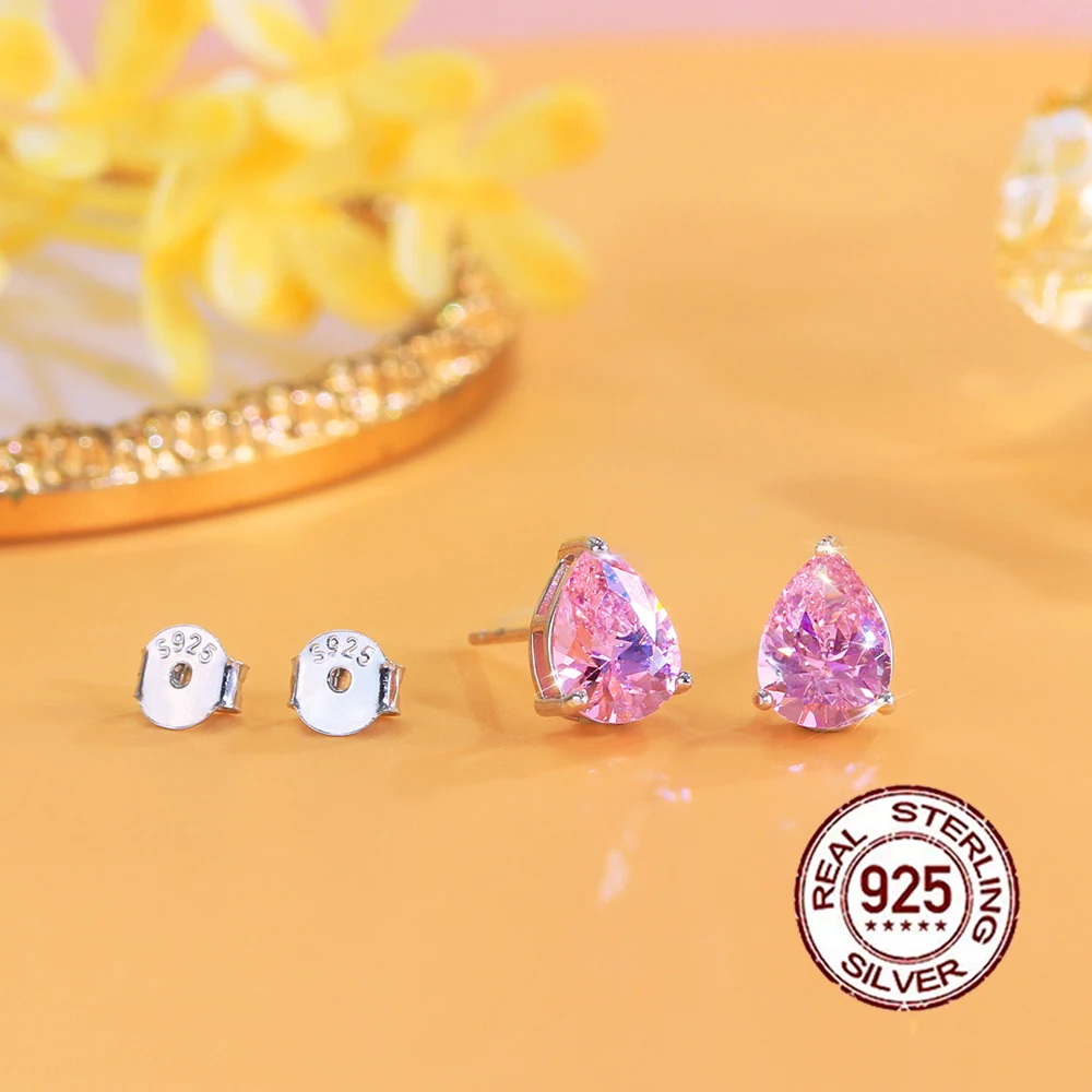 Brilliant Sterling Silver 925 Stud Earrings Zircon 8mm Big Water Drop Shape Pink Stud Earrings for Women Party Anniversary Gifts