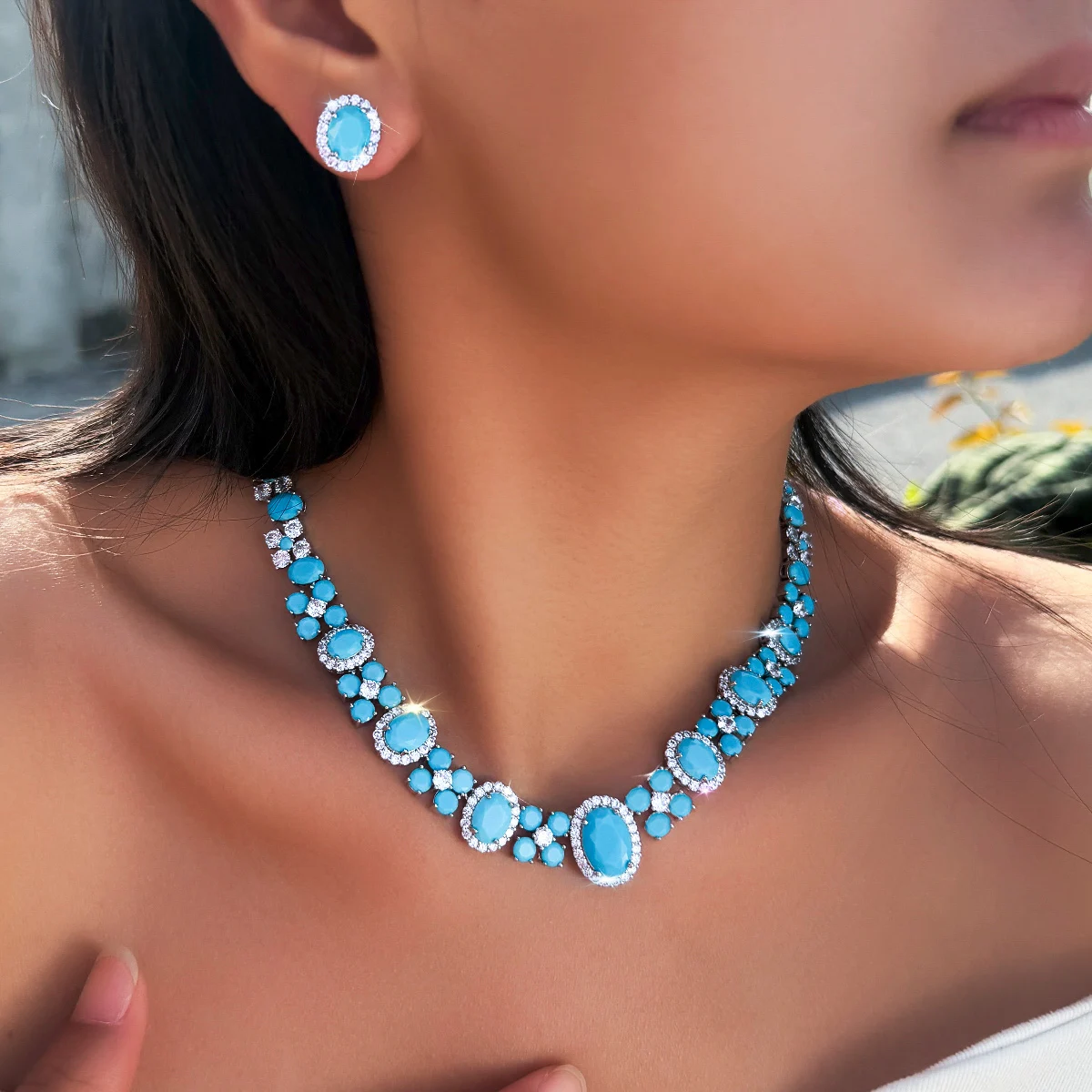 Charming Blue CZ Jewelry Set Turquoise Cubic Zirconia Oval Shaped Necklace Earrings Jewelry Set for Brides Wedding Costume Gift