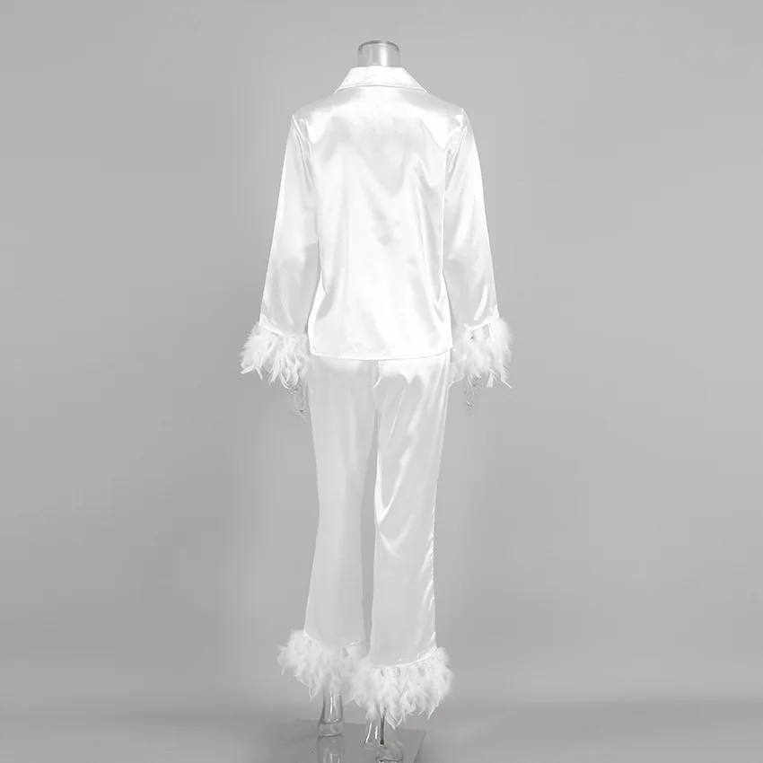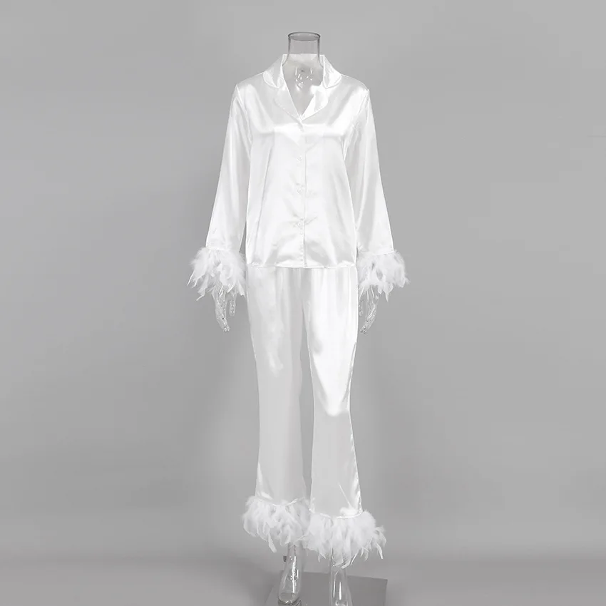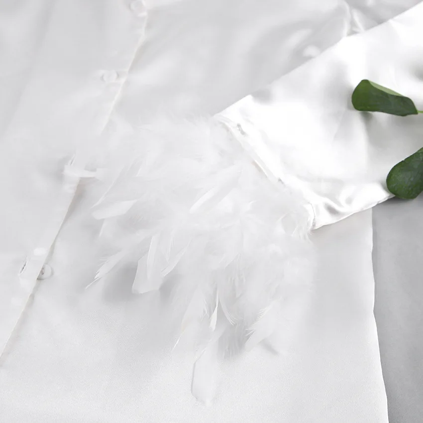 Custom Feather Silk Bridal Robes Satin Pajama Sets for Women