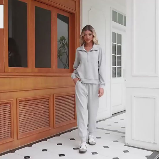 Step into the season in style with this custom-ready 2-piece set for women—your perfect companion for fall travel and everyday comfort. Featuring a sleek half-zip long sleeve top and matching jogger pants, this tracksuit effortlessly combines laid-back luxury with a modern edge. The tailored fit flatters your silhouette while offering all-day ease, making it ideal for airport looks, weekend getaways, or relaxed city strolls. Versatile, cozy, and fashion-forward, this matching set is your go-to outfit for looking put-together without compromising on comfort.