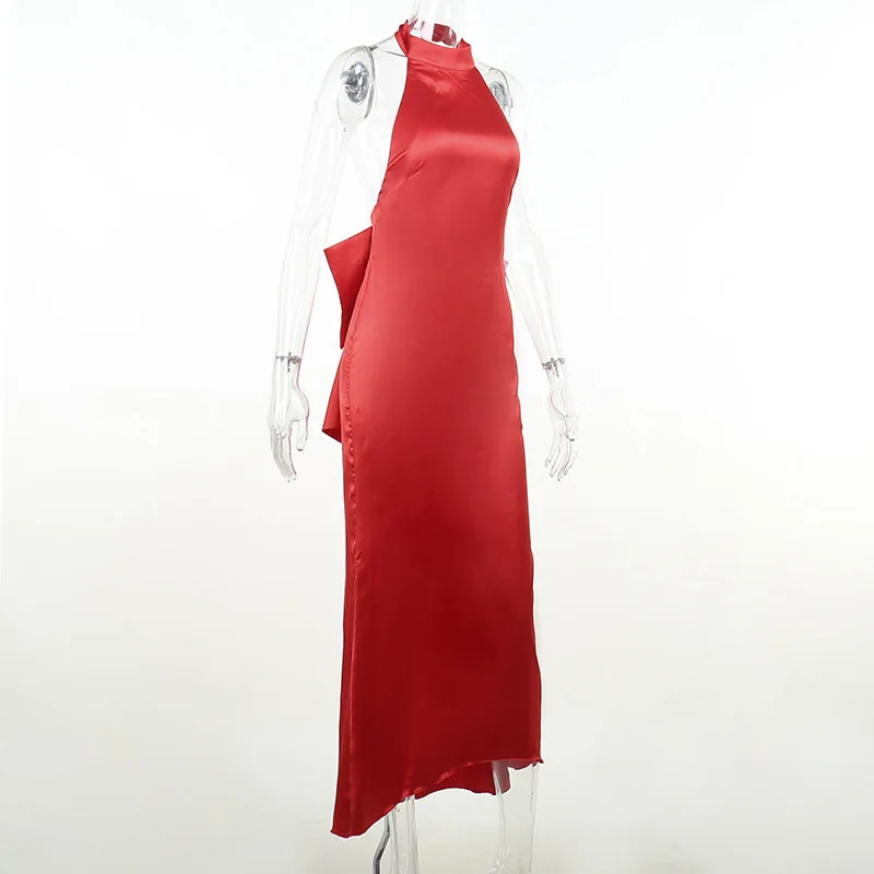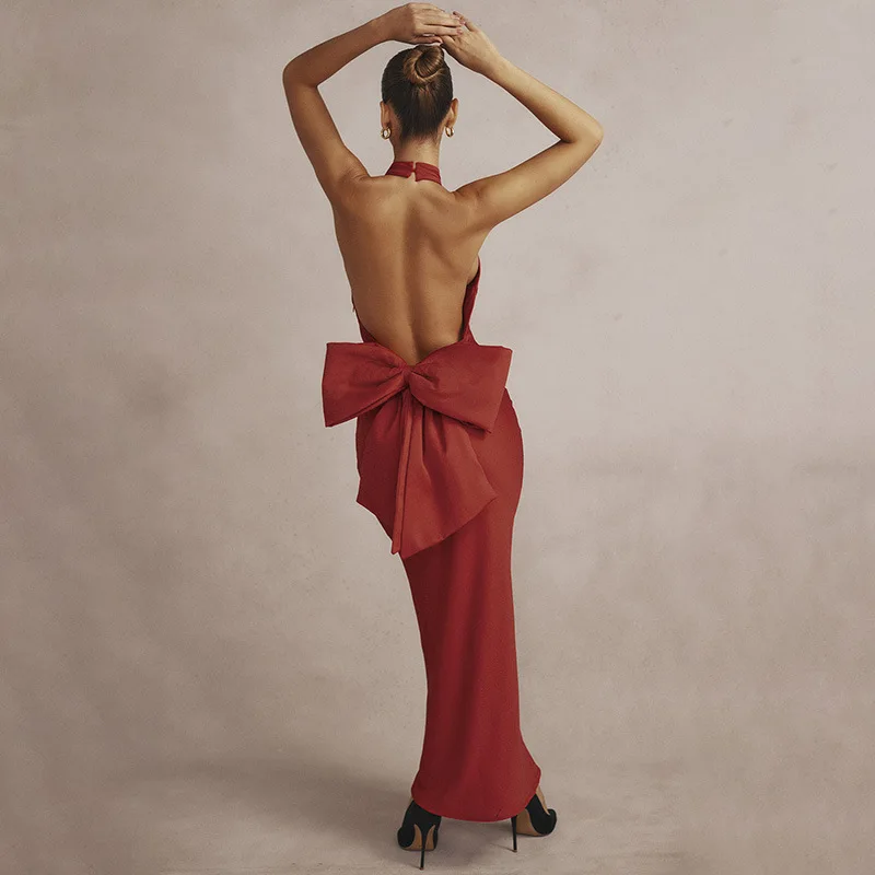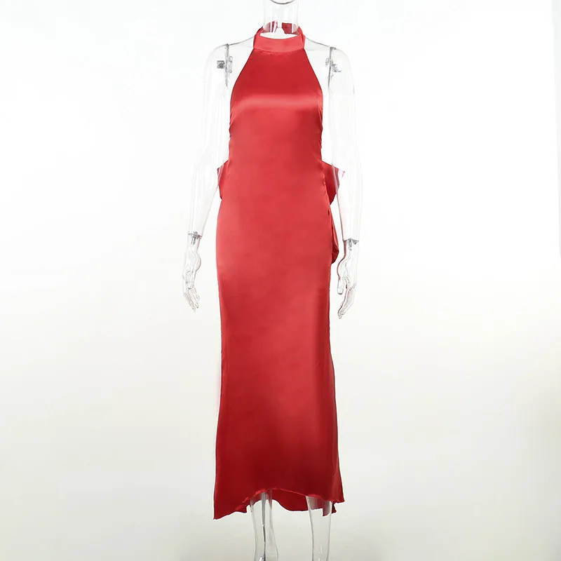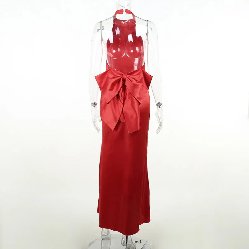 Custom Sexy Hang Neck Backless Red Big Bow Party Prom Gowns Evening Long Dresses for Women