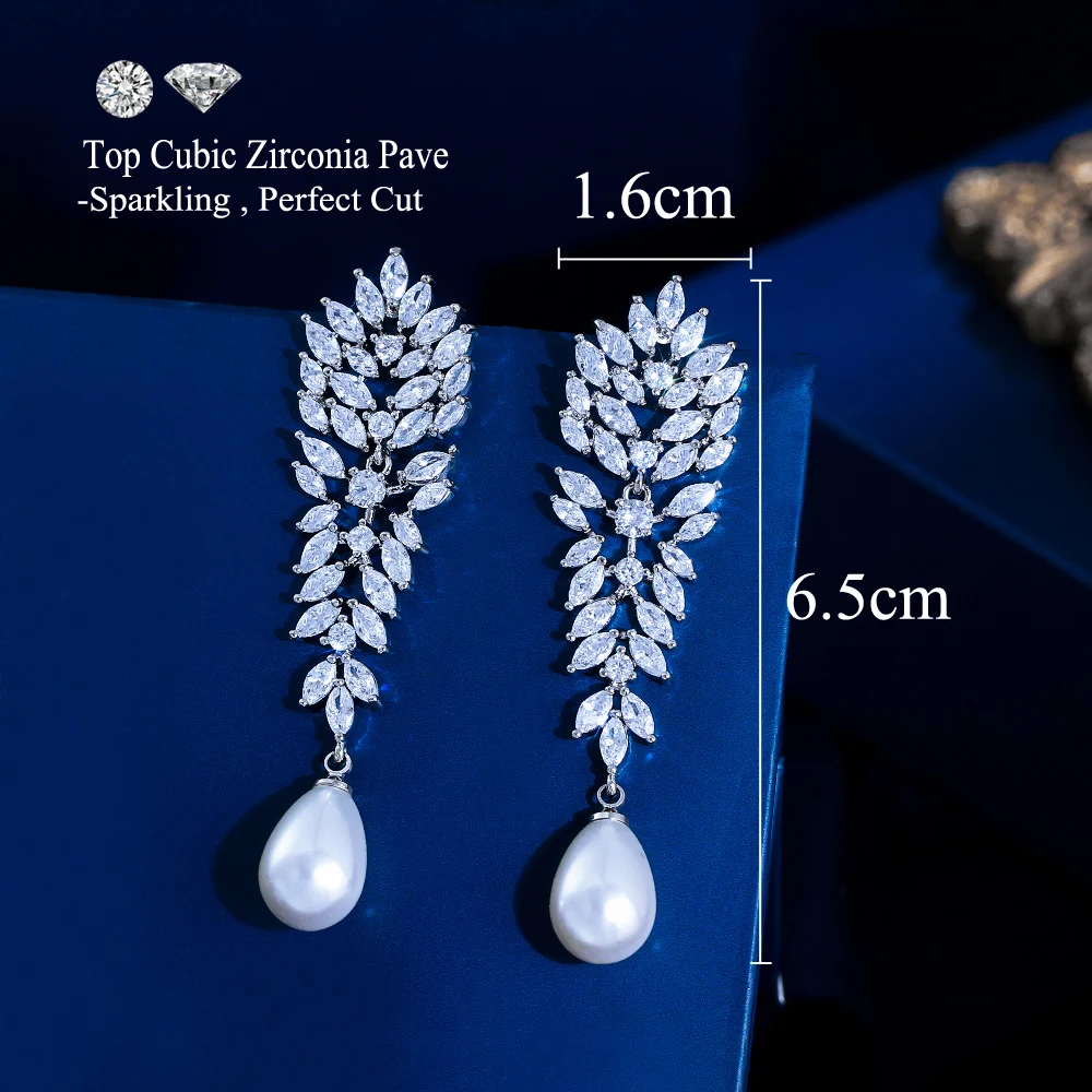 Elegant Shiny Marquise Cut Cubic Zirconia Long Leaf Drop Simulated Pearl Bridal Wedding Party Drop Earrings for Women Jewelry