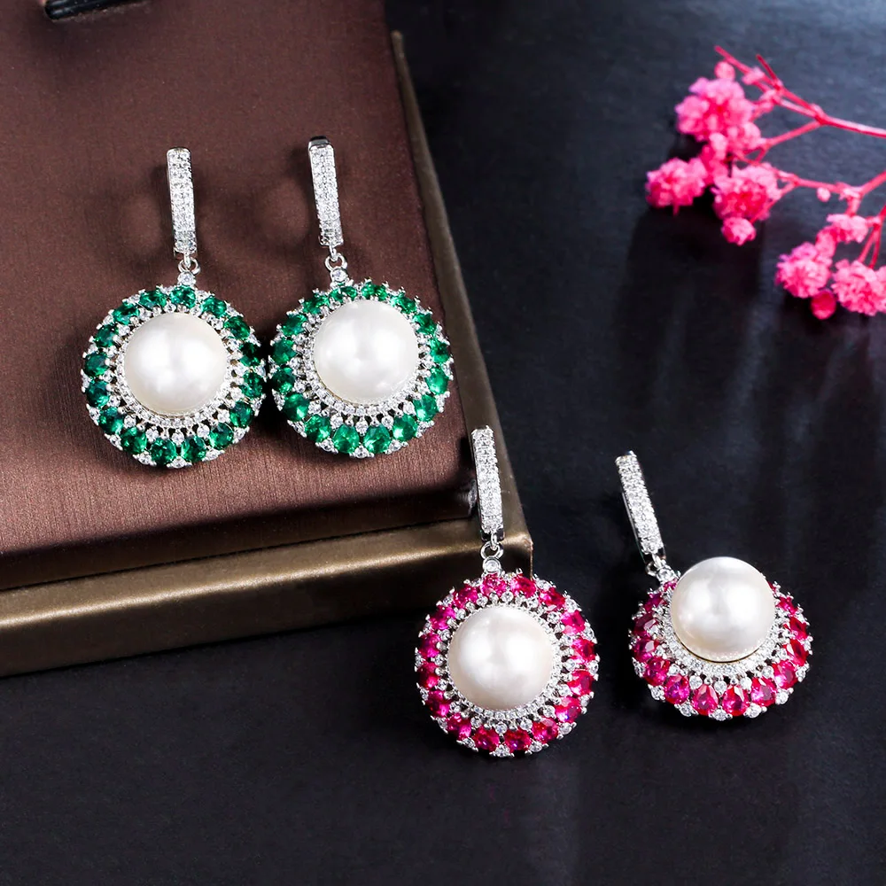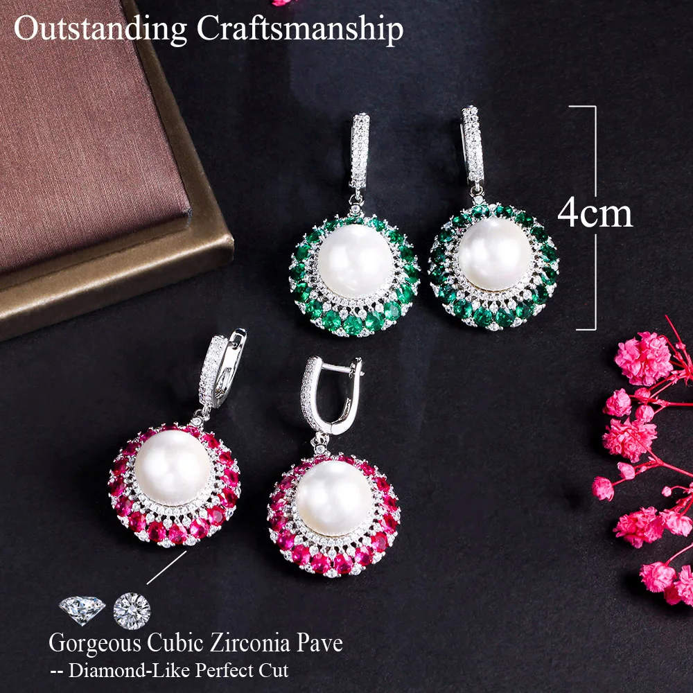 Fashion Silver Plated CZ Huggie Round Big Pearl Drop Earrings for Wedding Quality Green Red Cubic Zirconia Crystal Jewelry Gifts