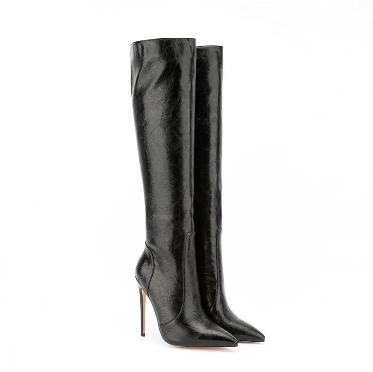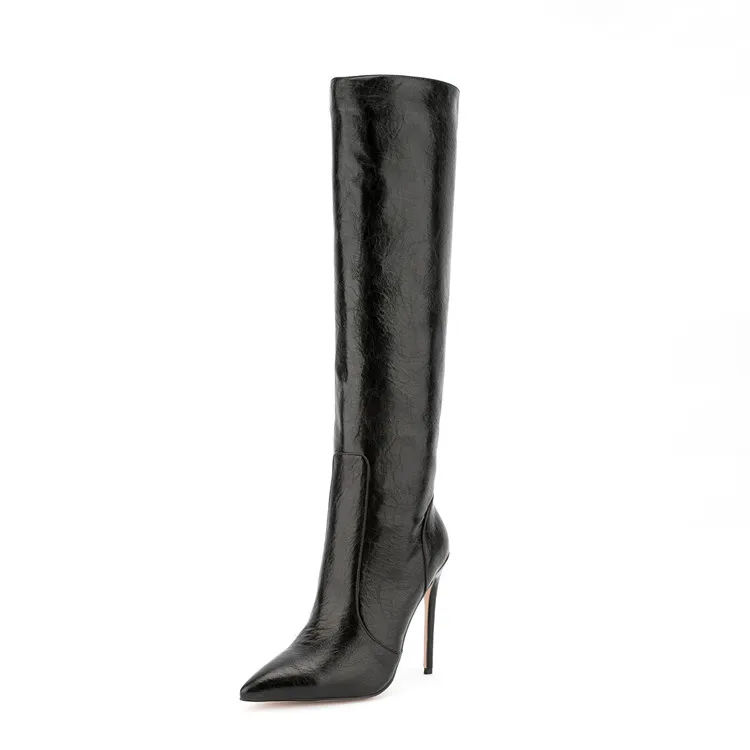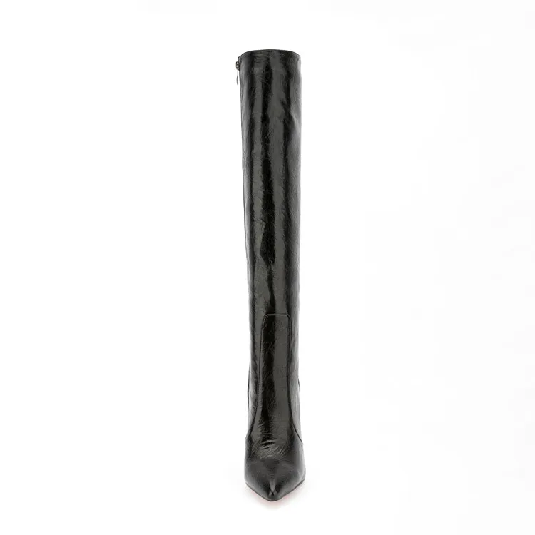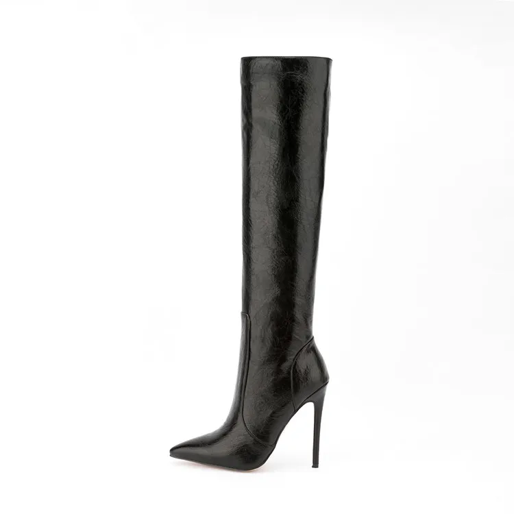 Fashion Style Crazy Horse Pattern Pointy Toe Long Boots Side Zipper Stiletto High Heel Knee High Boots for Women