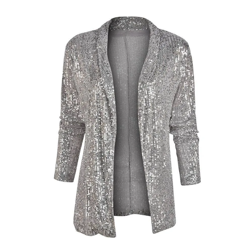 Glitter Long Sleeved Temperament Medium Length Small Suit Lapel Color Coat for Women