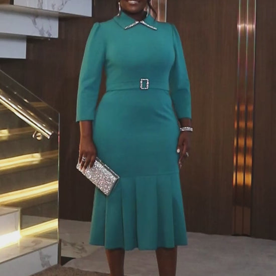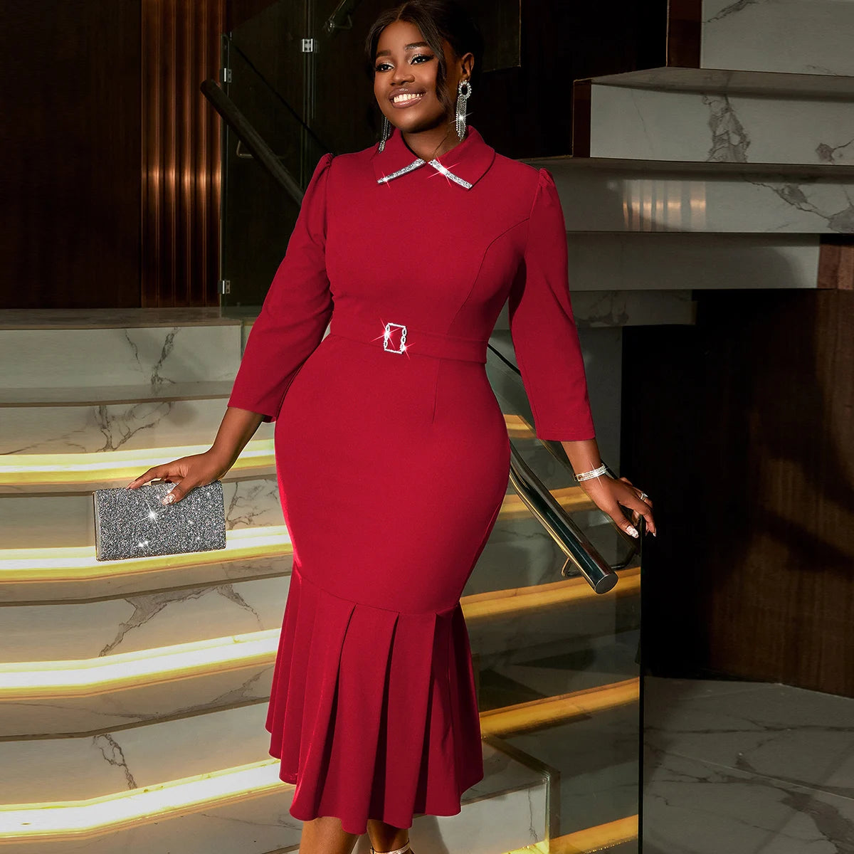 Step into refined elegance with this striking midi-length mermaid dress, tailored for the confident, modern professional. Crafted from breathable, eco-friendly polyester with a worsted, crocheted texture, it offers anti-wrinkle and anti-static performance—perfect for seamless transitions from desk to dinner. The flattering empire waist is highlighted by a sleek belt and subtle sequined accents that add just the right touch of glamour. A classic turn-down collar and three-quarter regular sleeves enhance its polished silhouette, while the trumpet-style hemline creates a sophisticated yet feminine finish. Designed for autumn days, this solid-hued piece balances structure and grace with effortless style.