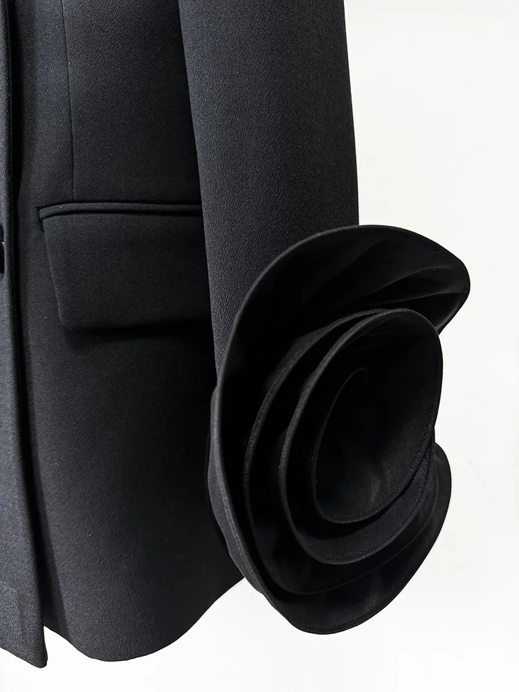 This high-quality blazer is a masterpiece of modern elegance, designed to be the standout piece of your 2026 spring wardrobe. Meticulously crafted for a slim-fit silhouette, it features a sophisticated V-neckline that elongates the frame and a sleek black finish that exudes timeless professionalism. The defining feature is the intricate 3D flower appliqués that cascade along the long sleeves, adding a sculptural, avant-garde touch to a classic formal structure. Perfect for high-profile business meetings, elegant luncheons, or sophisticated evening events, this jacket seamlessly blends artisanal craftsmanship with a refined feminine aesthetic, offering a versatile "all-match" layer for the woman who values both power and grace