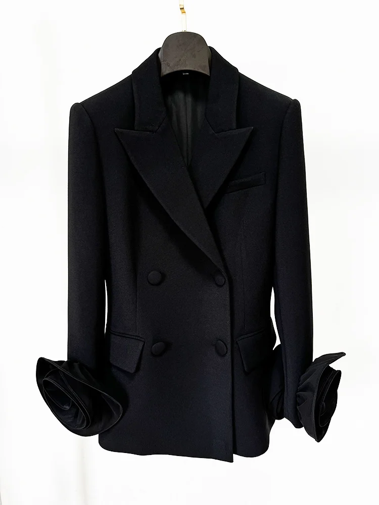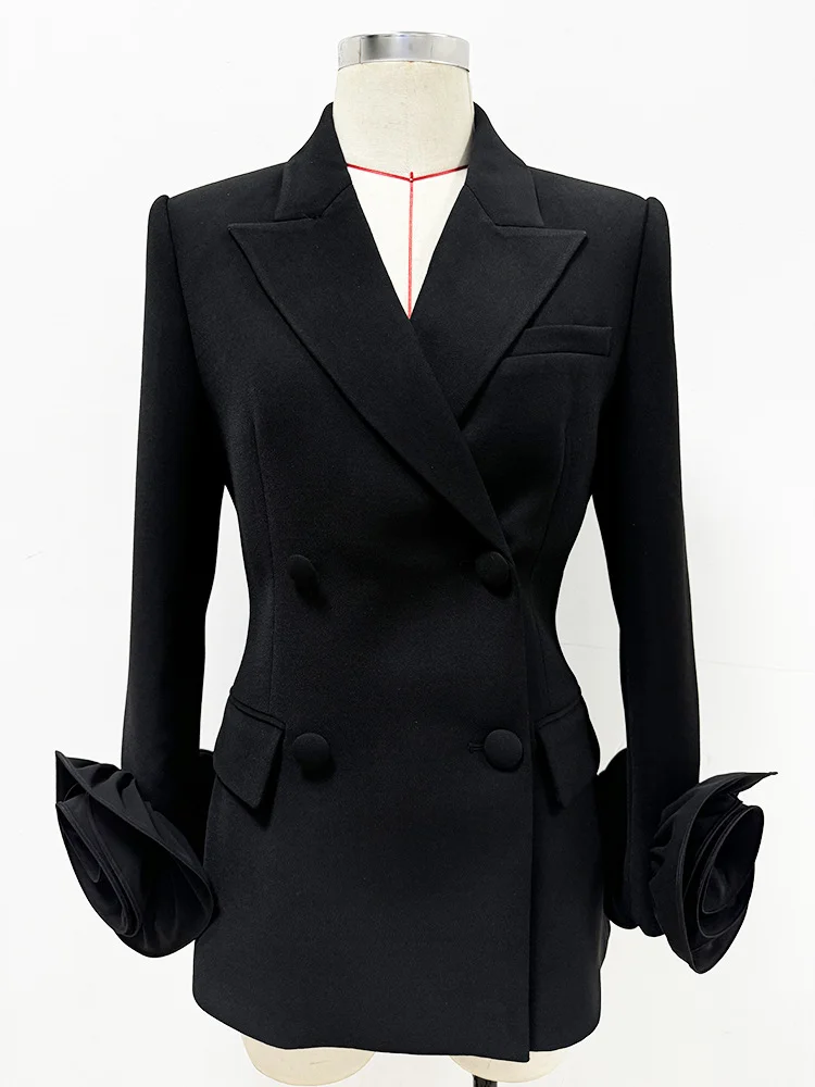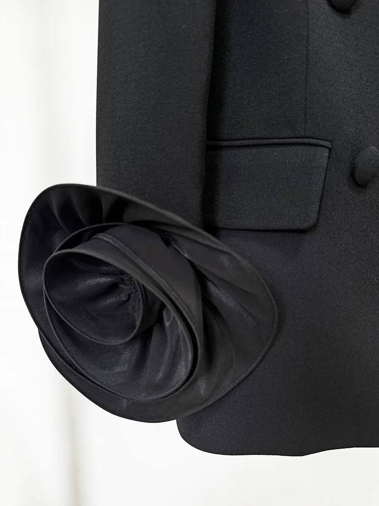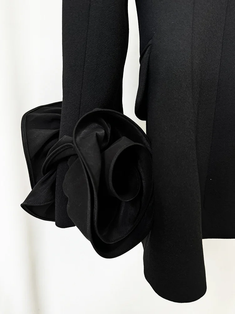 High Quality 3D Flowers Long Sleeve Blazer Spring Black V-Neck Slim Fit Elegant Women Jacket
