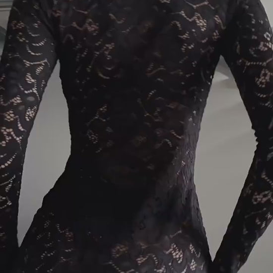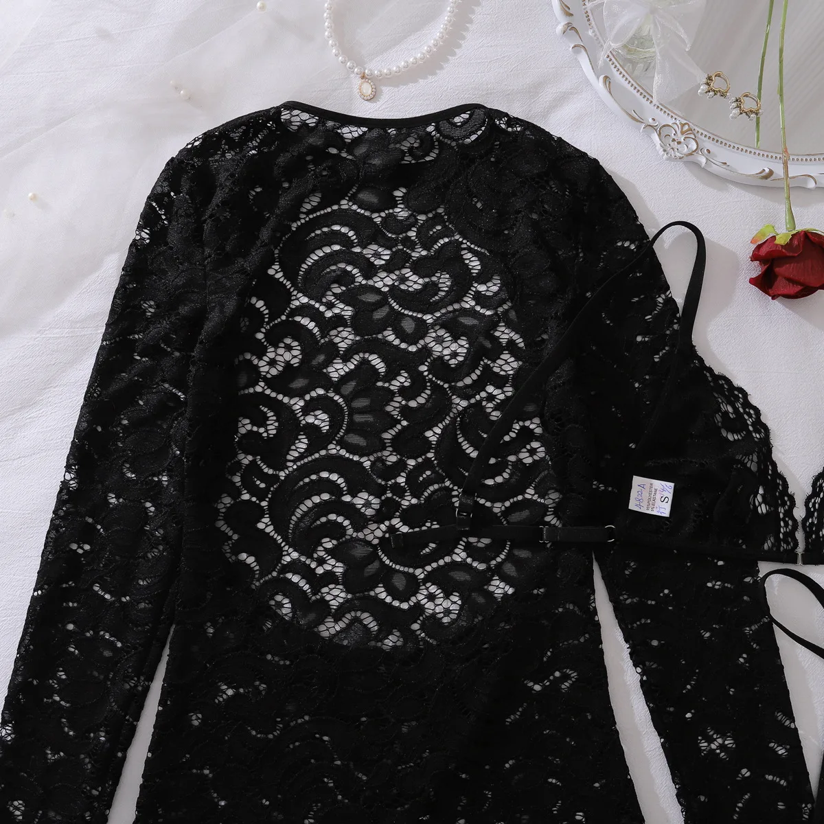 Hot Sale Girls Super Sexy Lace Sheer Top Open Back Fitted Skirt Black Lace Separate Sexy Mini Dress Lingerie Party Sexy Lingerie
