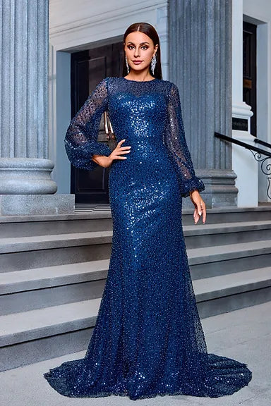 Indulge in the luxurious and exclusive . This navy masterpiece boasts a siren line silhouette and dazzling glitters for a show-stopping look. With long sleeves, a high neck, and an illusion neckline, this dress is both sophisticated and alluring. The back is elegantly covered, adding to the overall allure. Elevate your style with .