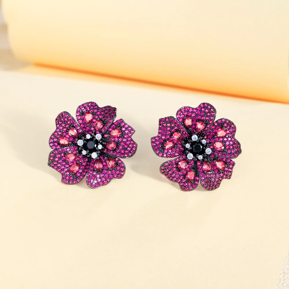 Luxury Rose Red Cubic Zirconia Big Flower Stud Earrings for Women Fashion Elegant Daily Party Costume Jewelry