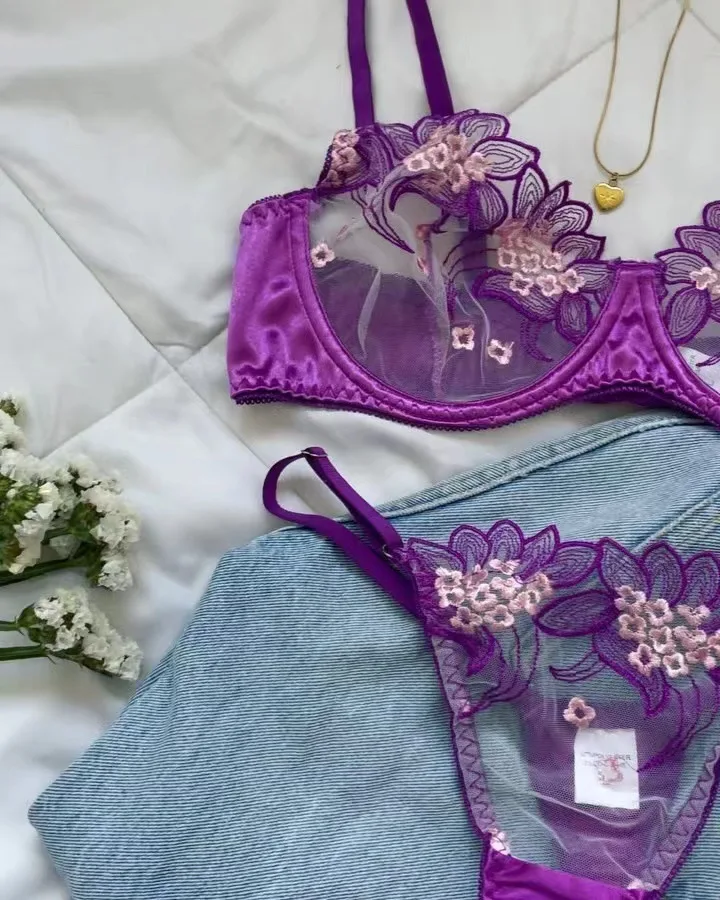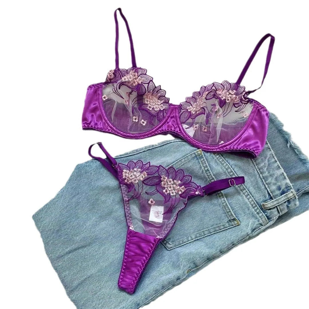 Sexy Lace Embroidery Underwear Two Piece Set Women's Big Breasts Small Thin Push-Up Bra Set Ladies Purple See Through Lingerie