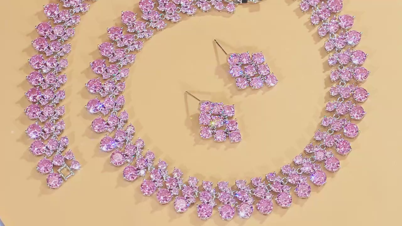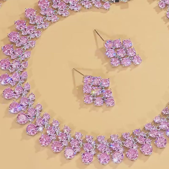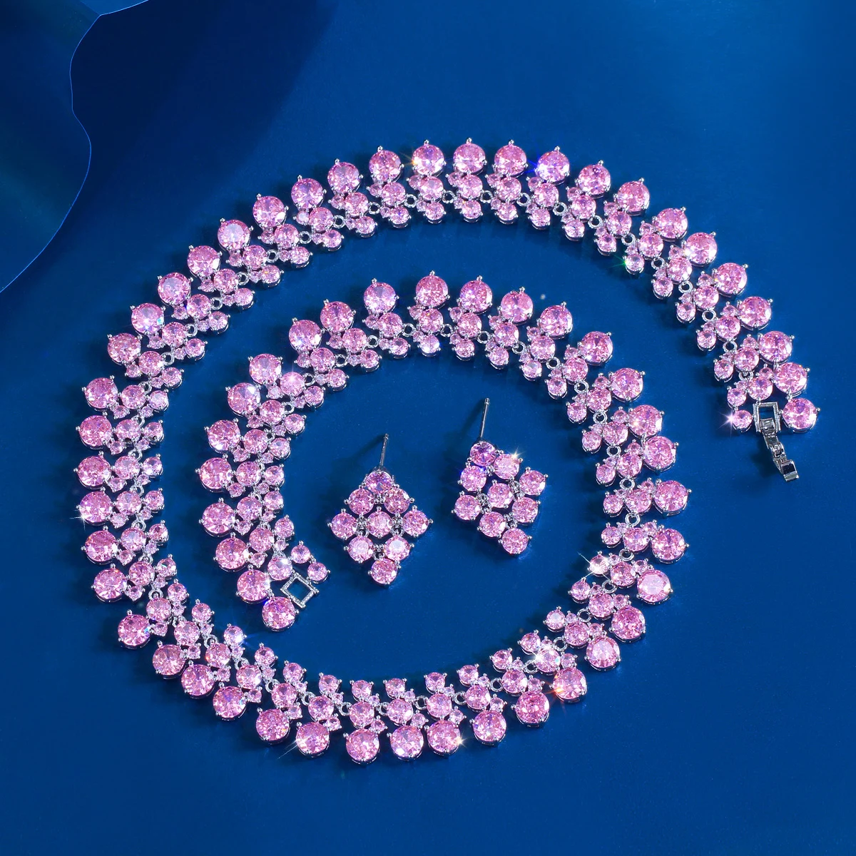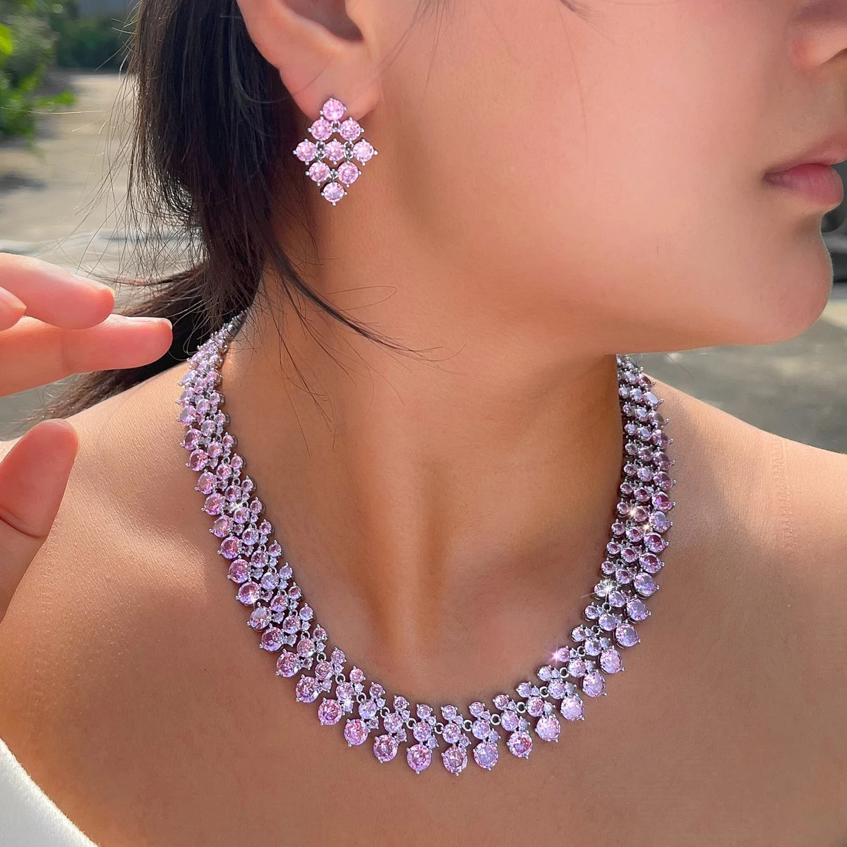 Super Luxurious Round Cubic Zirconia Necklace and Earrings Engagement Wedding Romantic Pink Chunky Big Jewelry Set for Women