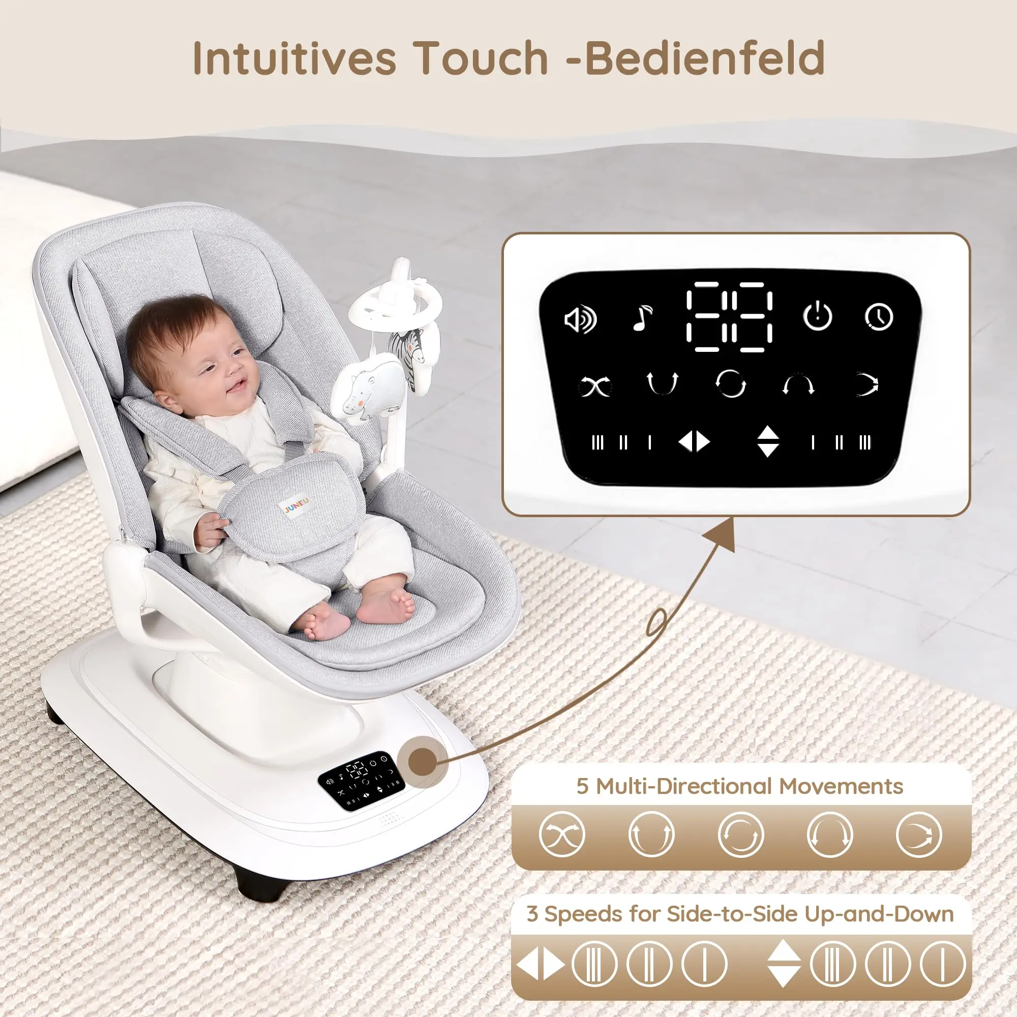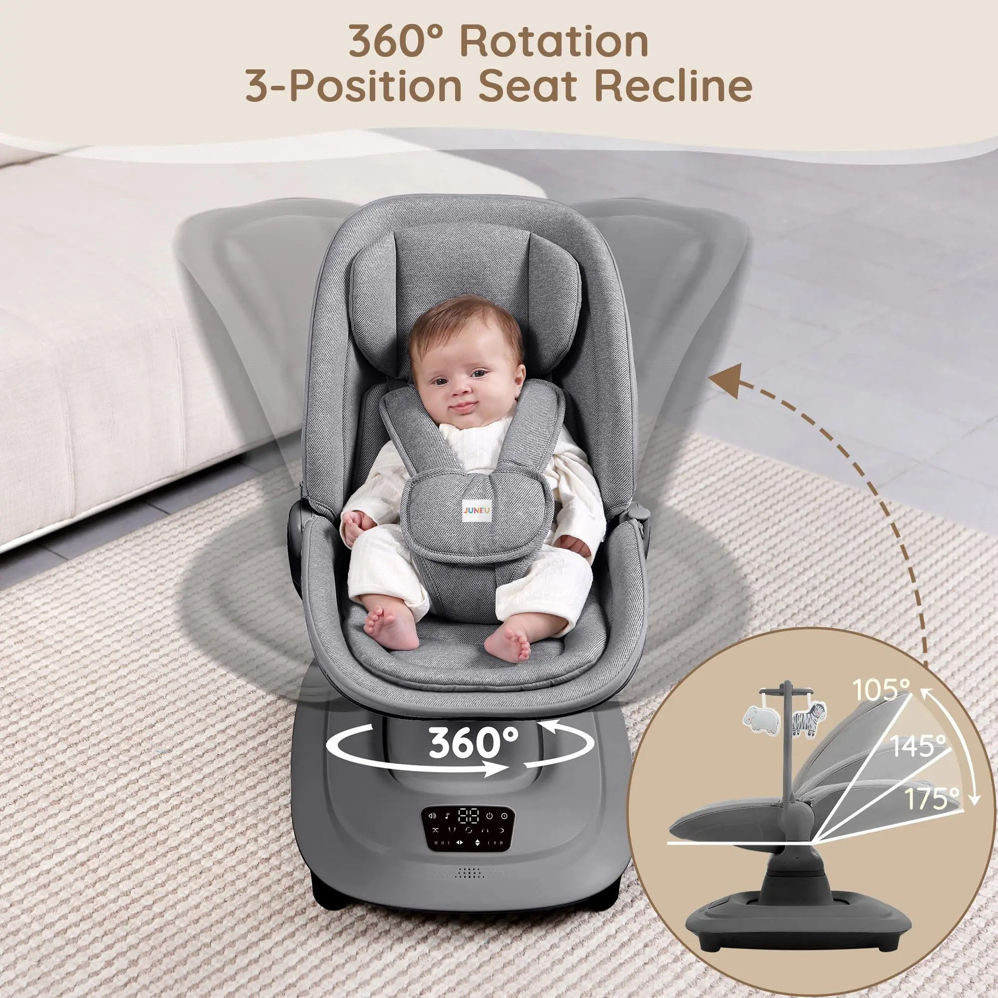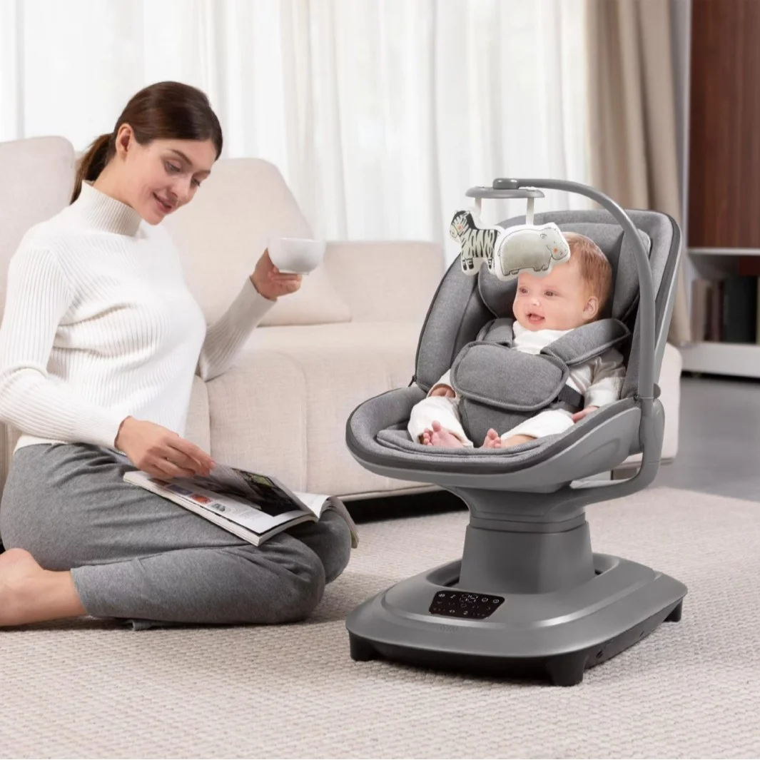 This automatic electric baby rocking chair is an intelligent and modern solution designed to provide ultimate comfort and entertainment for your baby while offering hands-free convenience for parents. The chair features multiple adjustable rocking speeds and motions to mimic natural soothing, while the integrated music system and Bluetooth connectivity allow you to stream your own selection of calming lullabies or engaging tunes. Crafted with plush, breathable fabric for a cozy environment and secured with an anti-slip base and safety harness, this swing ensures a safe, stimulating, and comfortable experience that blends thoughtful technology with practical parenting needs.