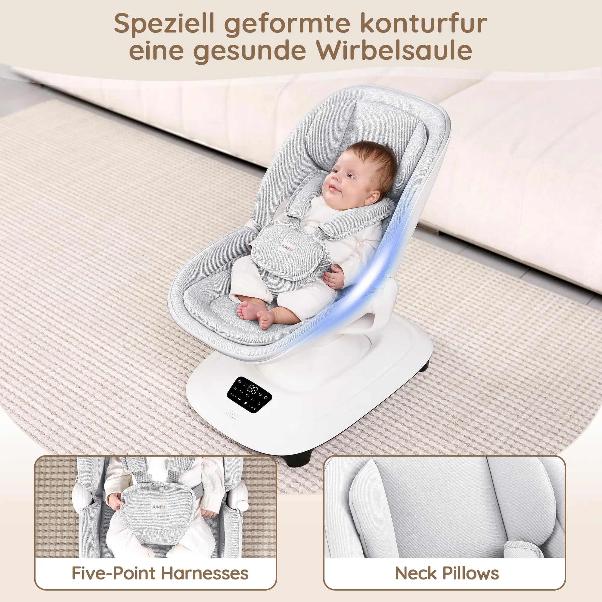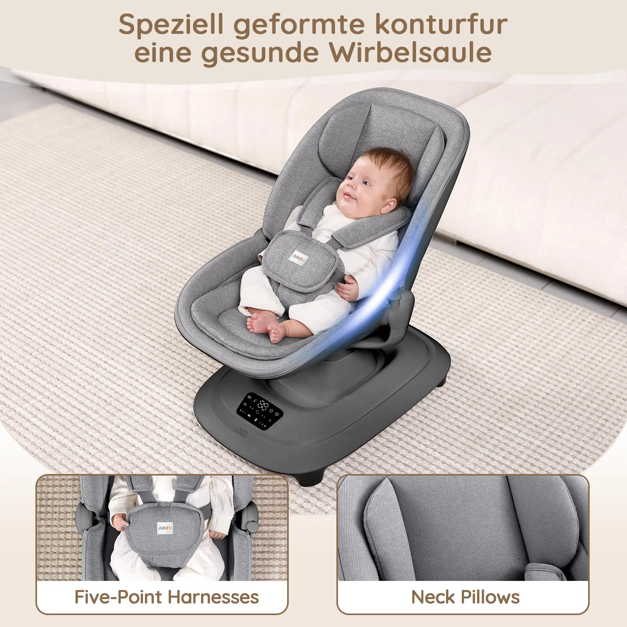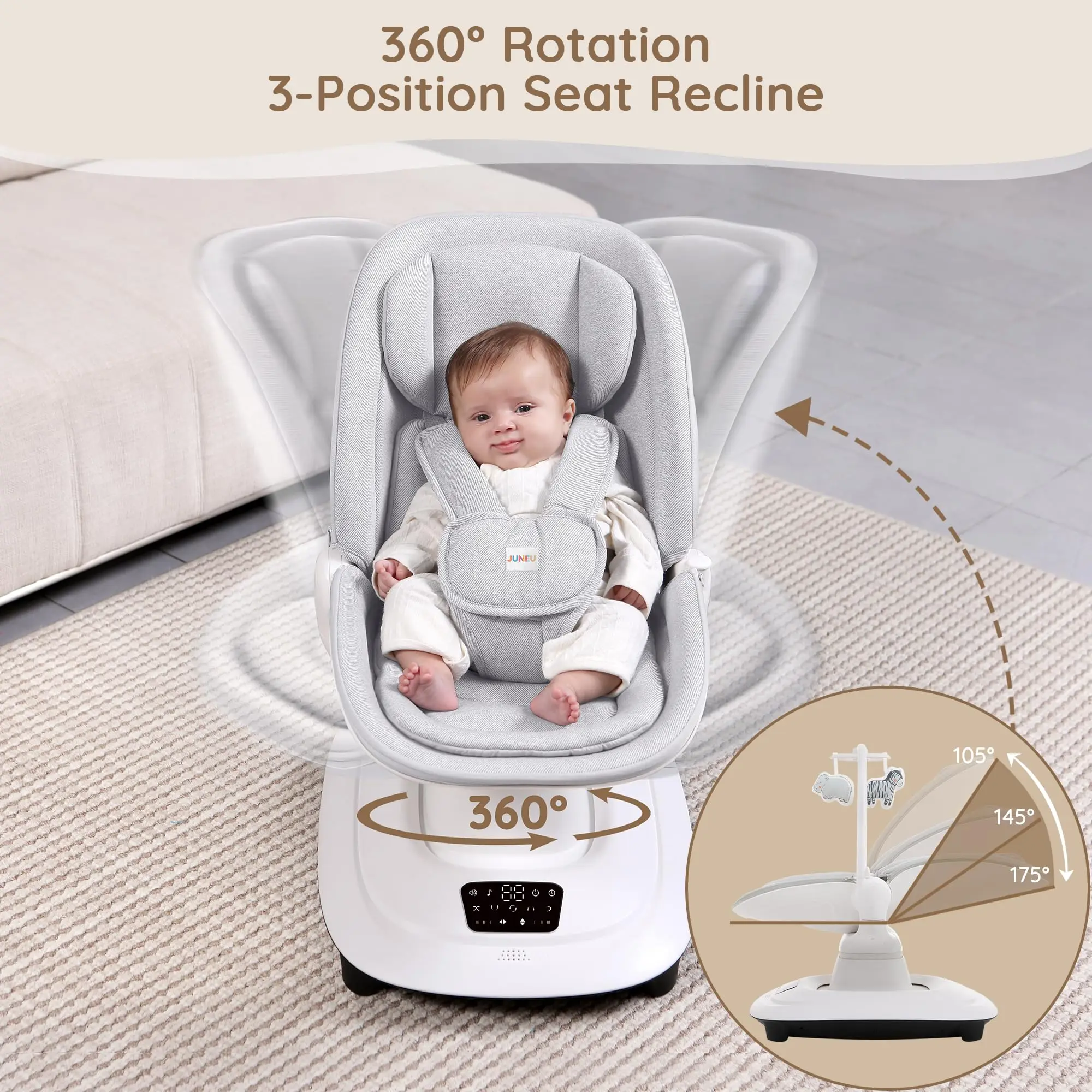 This automatic electric baby rocking chair is an intelligent and modern solution designed to provide ultimate comfort and entertainment for your baby while offering hands-free convenience for parents. The chair features multiple adjustable rocking speeds and motions to mimic natural soothing, while the integrated music system and Bluetooth connectivity allow you to stream your own selection of calming lullabies or engaging tunes. Crafted with plush, breathable fabric for a cozy environment and secured with an anti-slip base and safety harness, this swing ensures a safe, stimulating, and comfortable experience that blends thoughtful technology with practical parenting needs.