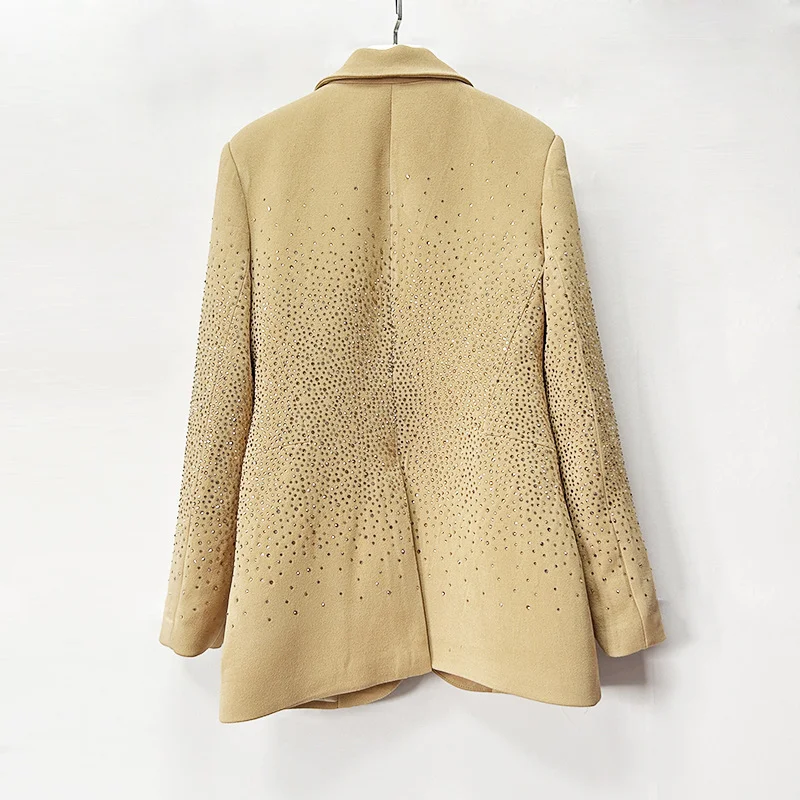 Women Diamond Crystal Beading Blazer for Women V-Neck Formal Wear Jacket Beige Spring Autumn Style