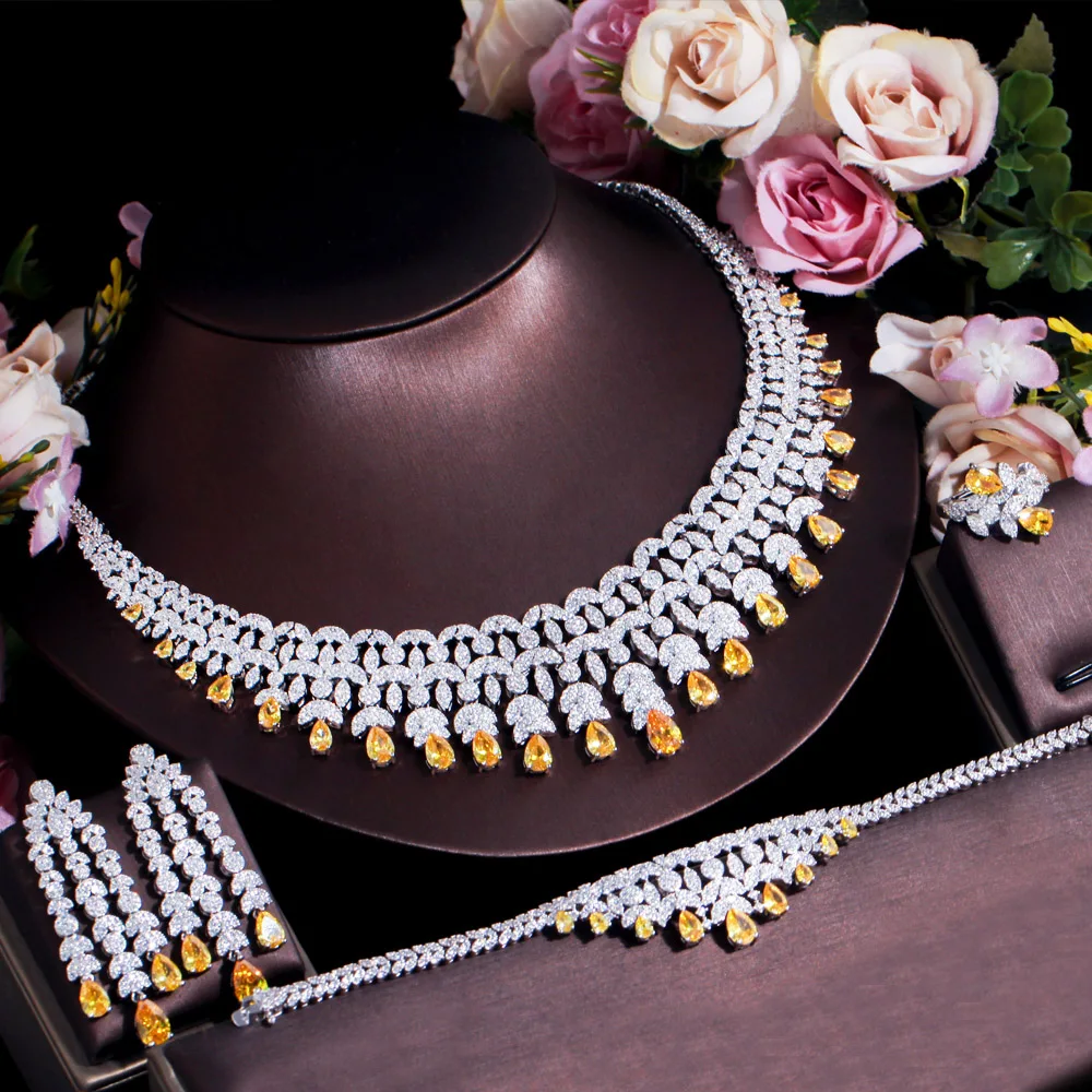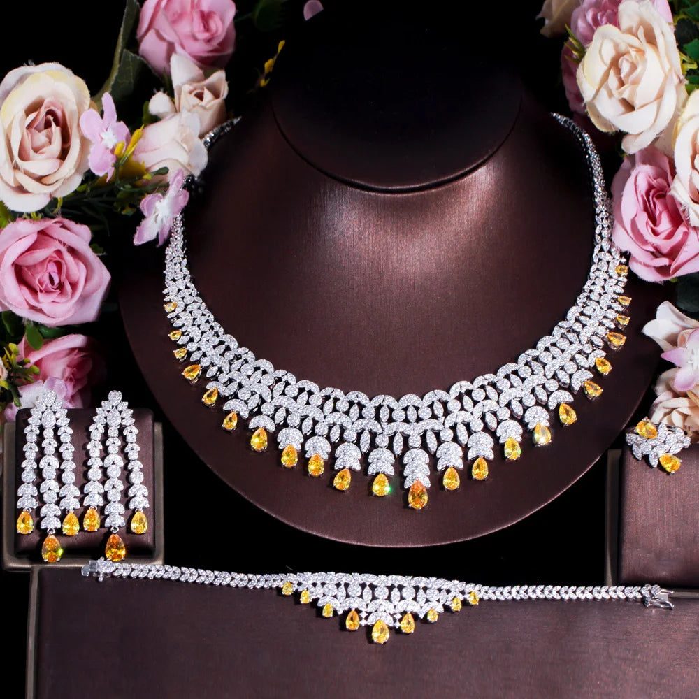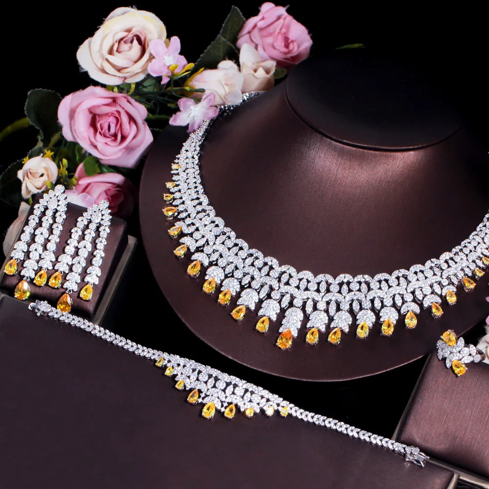 Yellow Zircon Luxury Indian Nigeria CZ Crystal Wedding Bridal Jewelry Set Big Tassel Necklace for Women Engagement Jewellery